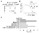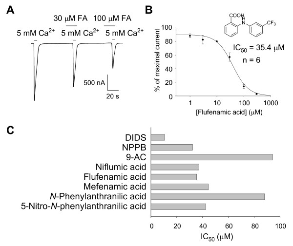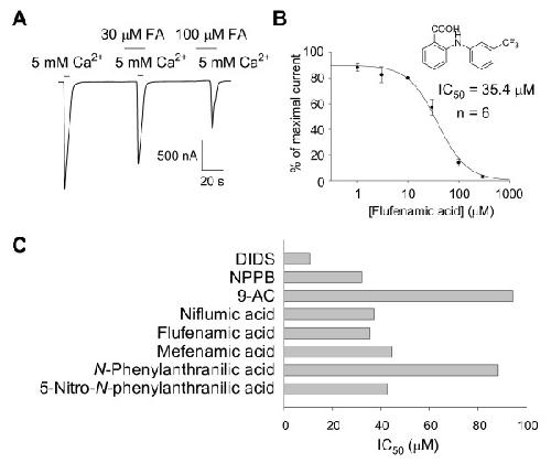 Figure 2. Effect of known blockers on Ca2+ activated Cl- channel. (A) Trace of Ca2+ activated Cl- channel current before and during application of flufenamic acid (FA). (B) Dose response relation of flufenamic acid block of Ca2+ activated Cl- current. (C) Summary of IC50s of commercially available blockers for Ca2+-activated Cl- channel. n indicates number of oocytes. Error bars indicate SEMs.