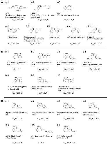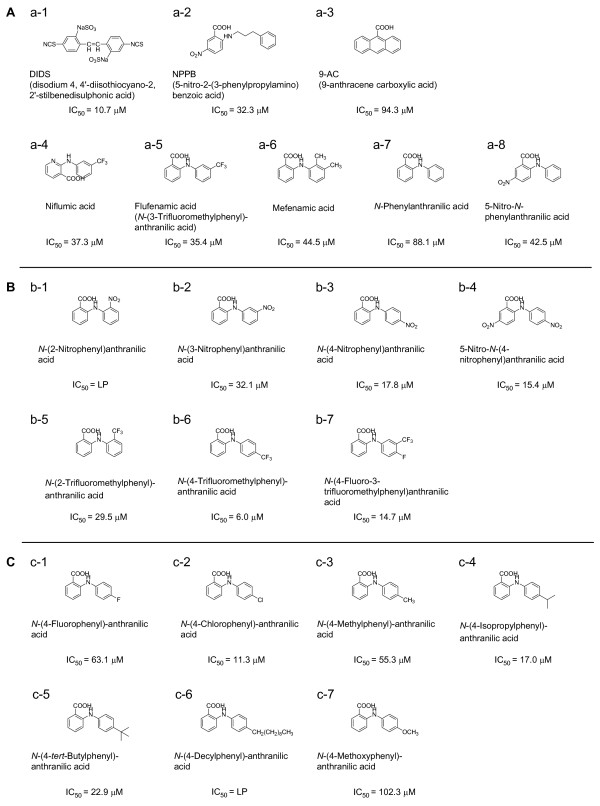 Figure 3. Chemical structures and IC50s of known blockers and anthranilic acid derivatives. (A) Known blockers. (B) Anthranilic acid derivatives; positional compounds. (C) Anthranilic acid derivatives that have variable substituent group on para position of benzene ring. LP: Low Potency. IC50 > 200 μM. n indicates number of oocytes.