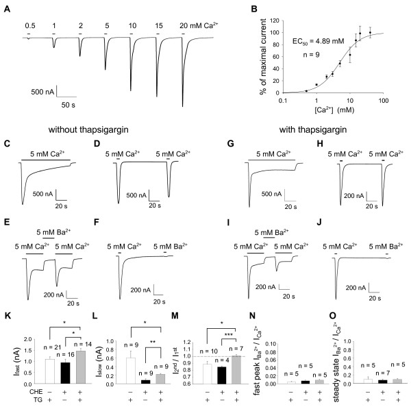 Figure 1. Endogeneous Ca2+ activated Cl- channels in Xenopus laevis oocyte. (A) Currents induced by extracellular Ca2+ in a dose dependent manner on ionomycin treated oocyte. (B) Dose response and EC50 of Ca2+ obtained from (A). (C~F) Currents recorded after treatment of ionomycin without thapsigargin treatment. (C, G) Fast peak and slow component during Ca2+ applications. (G~J) Currents recorded after treatment of ionomycin followed by thapsigargin. (D, H) Second application of Ca2+ induces slightly reduced fast peak amplitude compared to the first peak. (E, I) Ba2+ does not induce the slow component. (F, J) Ba2+ does not induce the fast peak. (K~O) Comparison of currents under each condition. CHE+ means that current was measured with chelerythrine added intracellular solution. TG+ indicates that thapsigargin was treated on ionomycin pretreated oocytes. (K) Fast peak amplitude. (L) Slow component amplitude. (M) Summary of the experiments shown in (D) and (H); Ratio of amplitude induced by the first and the second Ca2+. (N) Summary of the experiments shown in (E) and (I). (O) Summary of the experiments shown in (F) and (J). n indicates number of oocytes. Error bars indicate SEMs. * indicates statistically significant difference by two-tailed t-test. *, p < 0.05; **, p < 0.01; ***, p < 0.001