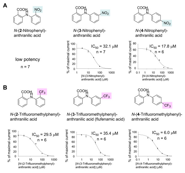 Figure 4. Positional effect of substituent group on the phenyl ring of blocker that affects block of Ca2+-activated Cl- current. (A) Comparison of chemical structure, IC50 and dose response between N-(2-nitrophenyl)anthranilic acid, N-(3-nitrophenyl)anthranilic acid and N-(4-nitrophenyl)anthranilic acid in which the nitro (-NO2) group on the benzene ring is positioned at ortho, meta and para position. (B) Comparison of chemical structure, IC50 and dose response between flufenamic acid and derivatives N-(2-trifluoromethylphenyl)anthranilic acid and N-(4-trifluoromethylphenyl)anthranilic acid in which the trifluoromethyl (-CF3) group on the benzene ring is positioned at ortho, meta and para position. Shaded boxes indicate the substituent groups tested. n indicates number of oocytes. Error bars indicate SEMs.