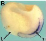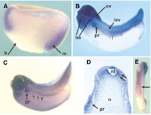 Fig. 1. Developmental expression of C1qA. (A) Bissected gastrula. Dorsal is to the right. Expression is restricted to the marginal zone mesoderm indicated by the arrow;(b) blastpore, (m) mesoderm. (B) Stage 28 embryo. Anterior is to the left and dorsalto the top. There is strong expression in the cephalic structures, especially in the branchial arches (ba) and in the otic vesicle (ov). Expression in the intersomitic veins is visible (isv). Pronephric expression has begun (pr). The small arrows indicate expression in the pronephric duct. (C) Stage 35 embryo shows detailed expression in pronephros (pr) and duct. At this stage, expression in the lateral muscle presursors (small arrows) is visible ventral to the duct. (D) Transverse section through an age- matched embryo to (C). The section is at the level of the pronephros. Dorsal is to the top. Somitic expression is most pronounced in the cells adjacent to the neural tube (nt) as indicated by the small arrows, and in the pronephros (pr). There is no staining in the notochord (n). (E) Ventral view of a stage 35 embryo reveals staining consistent with ventral blood island expression (arrow).