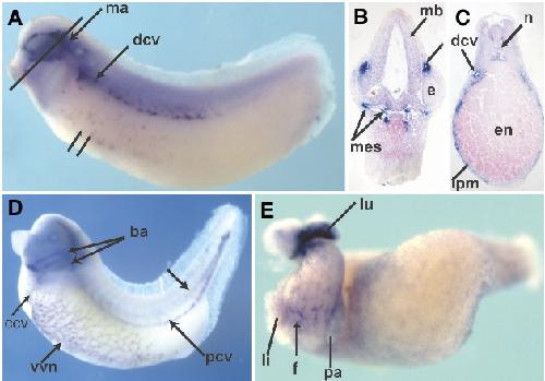 Fig. 2. Developmental expression of C1qR. Anterior is to the left and dorsal to the top unless otherwise specified. (A) Tailbud embryo. Marked expression in the mandibular seg- ment of the neural crest is indicated (ma). Double arrows indicate punctate ventral staining consistent with early vascular precursor expression. Expression in the dorsal cardinal vein is indicated (dcv). (B) Transverse section through the head of embryo in (A) (solid black line). Dorsal is to the top. The developing mesencephalon or mid-brain is labeled (mb). The small arrow to the right of the figure points to mandibular segment expression, dorsal to the developing eye (e). Expression in the head mesenchyme is shown, onsistent with neural crest expression. (C) Section through the trunk of a tailbud embryo (shown in D). Dorsal is to the top. The dorsal cardinal vein is indicated (dcv). Small struc- tures with a lumen in the lateral plate mesoderm (lpm) are consistent with expression in the developing vessels of vitelline network (vvn); (en) endoderm, (n) notochord. (D) Tailbud embryo showing expression throughout the devel- oping vasculature. In addition to the ventral vitelline net- work, both the common (ccv) and the posterior (pcv) cardinal veins show strong expression. There is some expression in the intersomitic veins as indicated by the small arrow. Expression in the branchial arches is labeled (ba). (E) Expression in the vasculature of the larval gut. The reticular pattern of the developing splanchnic vasculature is indicated in the foregut (f) but visible throughout, including in the liver and pancreatic buds. Expression is strongest in the lung bud. (li) liver, (lu) lung, (pa) pancreas.
