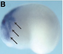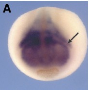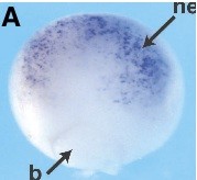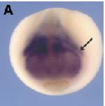 cfi (complement factor I) gene expression in Xenopus laevis embryo via in situ hybridization, NF stage 14, anterior view, dorsal up.