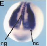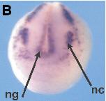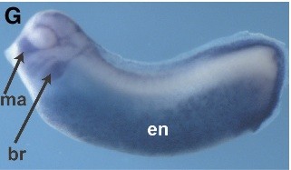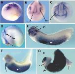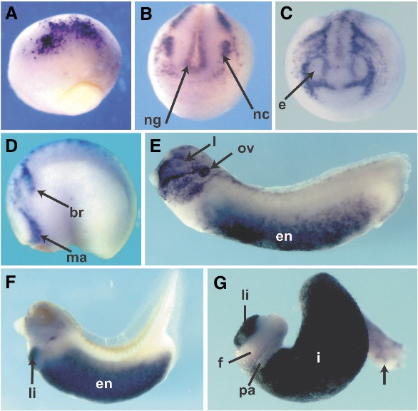 Fig. 7. Developmental expression of C9 from gastrula to organ bud stage. Anterior is to the left and dorsal to the top unless otherwise indicated. (A) Dorsal view of stage 10 embryo showing early spotted expression dorsal ectoderm. Anterior is to the top. (B) Anterior view of stage 17 embryo showing discrete neural crest (nc) and neural groove expression (ng). (C) Anterior view of stage 19-20 embryo. The three segments of the anterior neural crest show discrete expression at this stage. Mandibular segment ex- pression surrounds the presumptive eye field (e). (D) Lateral view of stage 22 embryo shows expression in mandibular (ma) and branchial segments (br) of anterior migrating neural crest. There is discrete hyoid expression noticeable between those two seg- ments. (E) Stage 27 embryo. Neural crest expression is seen in all three segments, as well as in the otic vesicle (ov), the lens (l), and the endoderm (en). (F) Stage 35 embryo shows strong liver and endodermal expression. (G) Isolated gut tube shows liver (li) and intestinal expression sparing the foregut (f), but no distal intestinal (proctodeum) expression (arrow); (lu) lung, (pa) pancreatic bud.