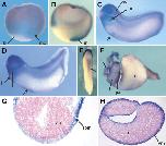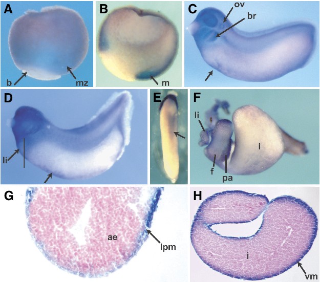 Fig. 4. Developmental expression of C3aR from gastrula to organ bud stage. (A) Whole mount in situ hybridization on a stage 10 gastrula showing expression predominantly in the marginal zone (mz); (b) blastopore. (B) Bissecting the gastrula revealed that the expression is mesodermal (m). In both (A,B) dorsal is to the right. (C) Stage 25 embryo showing expression in both the branchial segment of the neural crest (br) and in the otic vesicle (ov). Anterior is to the left, dorsal to the top. The arrow indicates early ventral blood island expression (VBI). (D) Stage 32 embryo. In addition to strong expression in cephalic structures, the presumptive liver area (li) is sur- rounded by cells expressing C3aR message. Arrow shows VBI expression. (E) Ventral view of same stage 32 embryo showing detail of VBI expression (arrow); head is to the top. (F) Isolated gut tube showing C3aR expression throughout the foregut (f) and presumptive intestine (i), (pa) pancreas. Anterior is to the left. (G) A section through the presumptive liver area (indicated in D) shows expression in lateral plate meso- derm (lpm) surrounding the anterior endoderm (ae). (H) Section through isolated gut showing staining in visceral mesoderm (vm), surrounding the presumptive intestine.