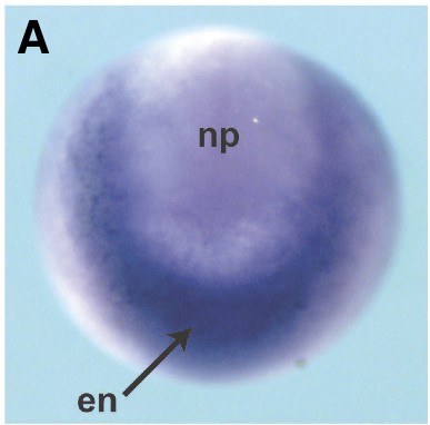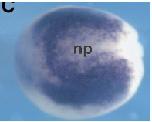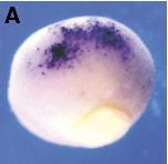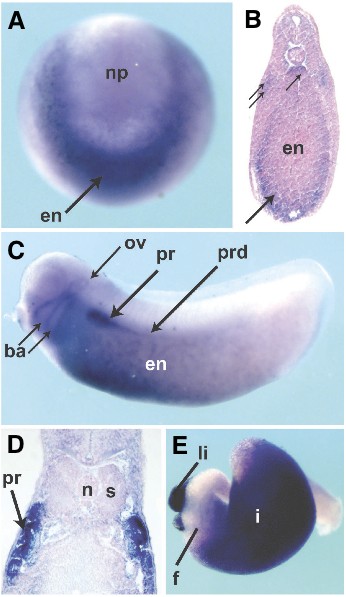 Fig. 5 (Left). Developmental expression of C3bC4bi. (A) Anterior view of a neurula stage embryo shows strong expression in the endoderm (en) lateral and ventral to the neural plate (np). (B) Transverse section of an early tailbud embryo in the presumptive trunk area. Dorsal is to the top. Expression is in the peripheral endoderm (large arrow) and in the archenteron roof (small arrow). Double arrows indicate early expression in presumptive kidney domains. (C) Tailbud embryo. Anterior is to the left. Endodermal expression is more extensive although not yet uniform. Expression in branchial arches (ba), the otic vesicle (ov), the pronephros (pr), and the pronephric duct (prd) are indicated. (D) Section through the proximal trunk of a tailbud embryo highlighting