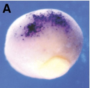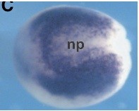 c3 (complement component 3) gene expression in Xenopus laevis embryo via in situ hybridization, NF stage 13, dorsal view, anterior left.