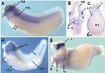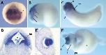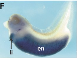 strong expression in the developing kidney. Dorsal is to the top; (n) notochord, (s) somite. (E) Isolated larval gut reveals strong expression in presumptive intestine (i) and liver (li), but no expression in foregut (f) and distal most segment of the developing intestine.