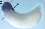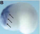 Fig. 6 (Right). Developmental expression of Properdin. Anterior is to the left and dorsal to the top unless otherwise specified. (A) Anterior view of a neurula stage embryo. Arrow indicates neural crest expression. (B) Late neurula/early tadpole stage embryo. Arrows indicate expression in mandibular, hyoid and mandibular segments of anterior neural crest (from anterior to posterior). (C) Tailbud embryo shows strong cephalic expression. Intense expression in developing eye (e) and hindbrain (hb) are indicated. The ventral arrow highlights beginning expression in the anterior endoderm. (D) Cross section through the hindbrain of the embryo in (C). Dorsal is to the top. Expression is limited to the dorsal most part of the neural tube, in the periventricular cells of the hindbrain; (v) ventricle. (E) Section through the developing eye of a tailbud embryo shows strong expression in the lens. Anterior is to the right. (F) In the isolated larval gut expression is confined to the liver bud only (li); (f) foregut, (i) presumptive intestine, (pa) pancreas.