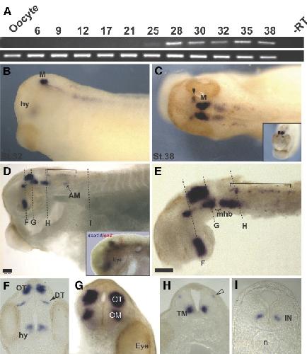 Fig. 3. Spatio-temporal expression pattern of sox14. (A) RT-PCR analysis from oocytes and embryos to stage 38 as indicated across the top. ODC (lower panel) was used as the loading control. (B-I) In situ hybridization of sox14 at indicated stages. In all figures, anterior is to the left. (B) Lateral view; (C) dorsal view, anterior view in the inset. (D) Sagittal sections of stage 38, double in situ of sox14 and en2 in the inset. (E) Dissected brain from stage 38 embryo. (F-I) Transverse sections from stage 32 (I) and 38 (F-H) embryos. Symbols: bracket, expression in vestibular nuclei; black arrowhead, dorsal thalamus; open arrowhead, dorsal hindbrainsox14 positive cells; M, midbrain; hy, hypothalamus; and AM, abducens motornucleus; mhb, midbrainhindbrain barrier; OT, optic tectum; DT, dorsal thalamus; OM, oculomotor motornucleus; TM, trochlear motornucleus; IN, interneurons. Black bar equivalent to 100 μm.