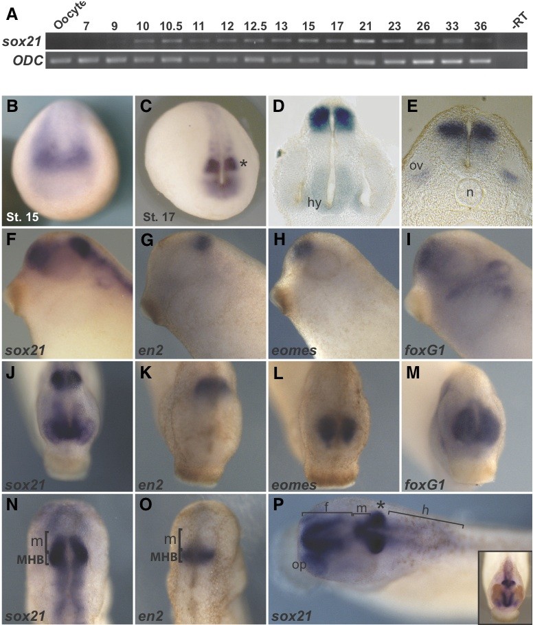 Fig. 4. Spatio-temporal expression pattern of sox21. (A) RT-PCR analysis of embryos from oocyte to stage 36 as indicated across the top. ODC was used as the loading control. (B,C,F,J,N,P) In situ hybridization of embryos stained for sox21 at indicated stages and (F-M, O) for regional brain markers as indicated. (B,C, J-M, inset P) Anterior views. (N-P) Dorsal views. (F-I) Lateral views. (D,E) Transverse sections generated from a stage 31 embryo. Symbols: Black asterisks, midbrain-hindbrain boundary; f, forebrain; h, hindbrain; m, midbrain; hy, hypothalamus; n, notochord; op, olfactory placode; ov, otic vesicle.