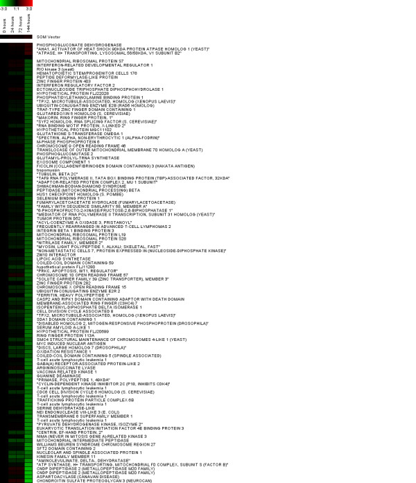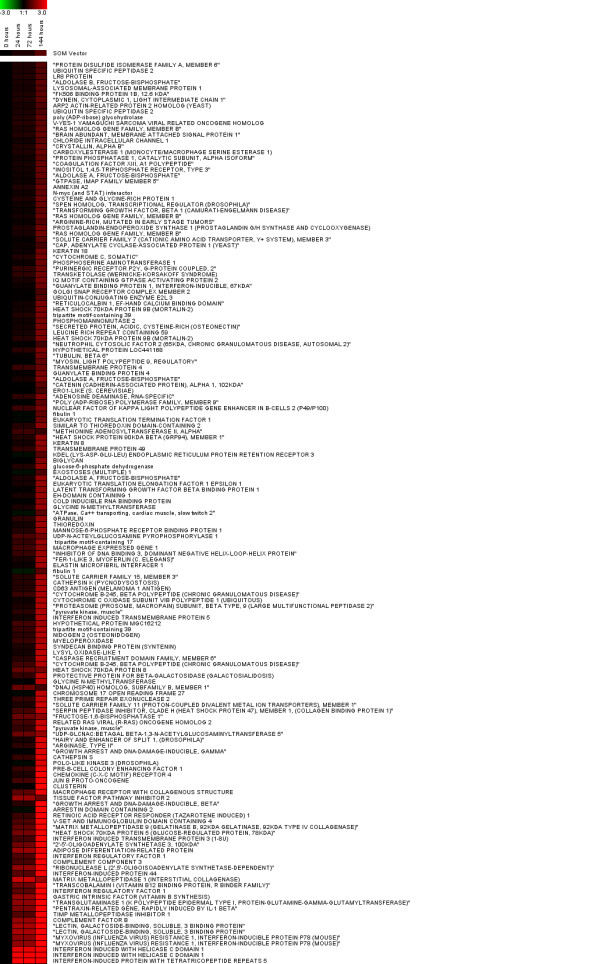 Figure 2. Expression profiles for cluster 1. Each row represents an individual gene, and each column a post-infection time point. Red coloration indicates increased expression of a gene relative to uninfected animals, and green indicates decreased expression. Genes (Cluster 1, n = 158) identified to be significantly up-regulated in response to ATV infection.
