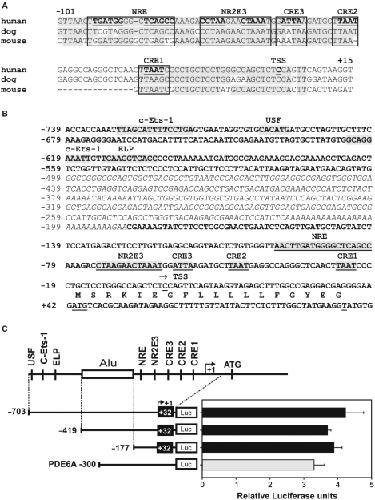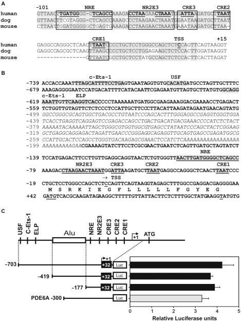 Figure 1. Analysis of conserved transcription factor binding sites in the RS1 promoter and delineation of the proximal region. (A) Sequence alignment of the putative RS1 promoter regions from human, dog and mouse. Conserved sequences are highlighted in gray and canonical binding sites for CRX (CRE1 to 3), NR2E3 and NRL (NRE) are boxed. (B) DNA sequence of the putative human RS1 promoter. Potential cis-elements are indicated. An interspersed ALU repeat is italicized. (C) Basal activity of three RS1 promoter–luciferase constructs (−703/+32, −419/+32, −177/+32) and of a PDE6A positive control (−300) transfected into Y79 retinoblastoma cells. RS1 promoter activities are comparable to the PDE6A promoter, which is known to be active in Y79 cells. A schematic of the RS1 promoter is shown with transcription factor binding sites and the ALU repeat (box). Each transfection was repeated three times with duplicate wells analyzed. Error bars represent the standard deviation of the mean from protein normalized luciferase activities.