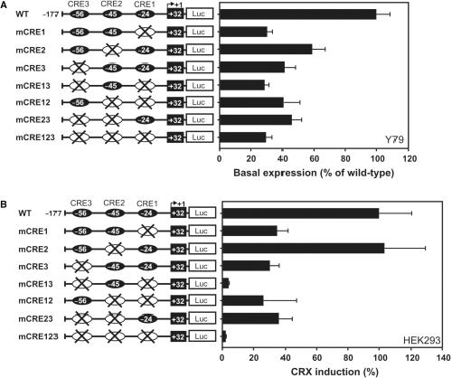 Figure 4. Delineation of the critical sequences required for CRX binding and RS1 promoter activity. Luciferase assays were performed with the RS1 wild-type promoter construct −177/+32, and CRE single-, double- and triple mutant promoters in Y79 cells (A) and HEK293 cells cotransfected with CRX (B). The basal luciferase activity of the wild-type contruct −177/+32 (A) or the CRX-induction of the wild-type contruct −177/+32 was set to 100%. Each transfection was repeated three times with duplicate wells analyzed. Error bars represent the standard deviation of the mean from protein normalized luciferase activities.