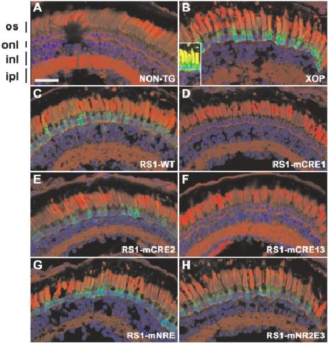 Figure 5. In vivo analysis of RS1 promoter–GFP constructs. Confocal micrographs of transgenic X. laevis retinae expressing GFP (green) under the control of various promoters. Cryosections were counterstained with wheat germ agglutinin (red) and Hoechst nuclear stain (blue). (A) Nontransgenic control retina (NON-TG); (B) Xenopus opsin promoter (XOP); (C) RS1 promoter wild type (RS1-WT); (D) RS1 promoter with mutated CRE1 (mCRE1); (E) RS1 promoter with mutated CRE2 (mCRE2); (F) RS1 promoter with mutated CRE1 and CRE3 (mCRE13); (G) RS1 promoter with mutated NRE (mNRE); (H) RS1 promoter with mutated NR2E3 (mNR2E3). GFP was not expressed in the nontransgenic retina but was highly expressed in photoreceptors in the XOP retina. The wild-type RS1 promoter (NON-TG) drives GFP expression in photoreceptors albeit at lower levels. Abolishing NRL and NR2E3 binding did not significantly alter GFP expression (G and H). Mutating the CRE1 site (D and F) reduced GFP expression to below detectable limits, but no obvious effect resulted from mutating the CRE2 site (E). The GFP signals in panels A and C-H are directly comparable as the same laser intensity and amplifier setting were used, and identical image processing was applied. In panel B, the amplifier gain was reduced due to the intensity of the GFP signal. The inset shows an image acquired with settings equivalent to the other panels. Photoreceptor outer segments (os), outer nuclear layer (onl), inner nuclear layer (inl) and inner plexiform layer (ipl). Scale bar, 50 µm.