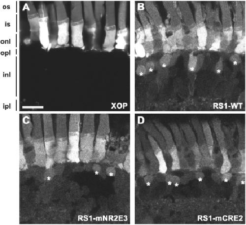 Figure 6. RS1 promoter activity in bipolar cells. (A–D) Confocal micrographs of transgenic retinas expressing GFP. (A) Within the retina, the X. laevis opsin promoter drives expression exclusively in rod photoreceptors. In contrast, the RS1 promoter (B) drives expression in both photoreceptors and bipolar cells (asterisks). Mutant RS1 promoters lacking NR2E3 (C) or CRE2 (D) sequences were also capable of driving expression in bipolar cells. Photoreceptor outer segments (os), inner segments (is), outer nuclear layer (onl), outer plexiform layer (opl), inner nuclear layer (inl) and inner plexiform layer (ipl). Scale bar, 20 µm.