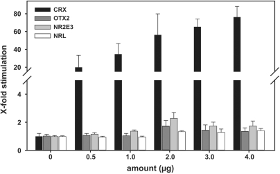 Figure 2. RS1 promoter induction levels by CRX, OTX2, NR2E3 and NRL. HEK293 cells were cotransfected with the −177/+32 RS1 promoter–reporter construct and transcription factor expression vectors. X-fold stimulation values were calculated by normalizing CRX, OTX2, NRL and NR2E3 cotransfected cells to mock-vector transfections. CRX (black bars) specifically induces the RS1 promoter in a dose-dependent manner. OTX2 (dark gray bars), NR2E3 (light gray bars) and NRL (white bars) do not induce or suppress the RS1 promoter. Each transfection was repeated three times with duplicate wells analyzed. Error bars represent the standard deviation of the mean from protein normalized luciferase activities.