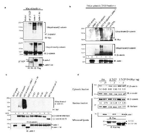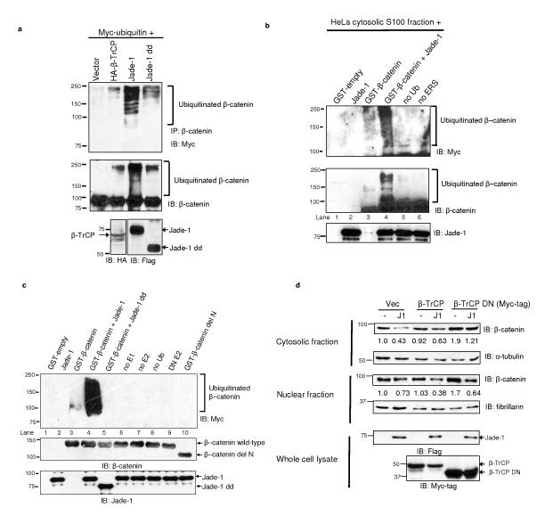 Jade-1 inhibits Wnt signalling by ubiquitylating beta-catenin and mediates Wnt pathway inhibition by pVHL.