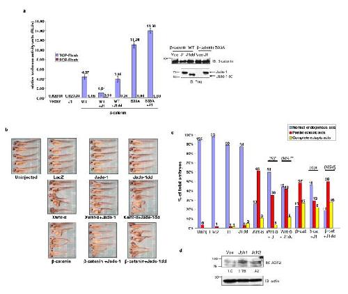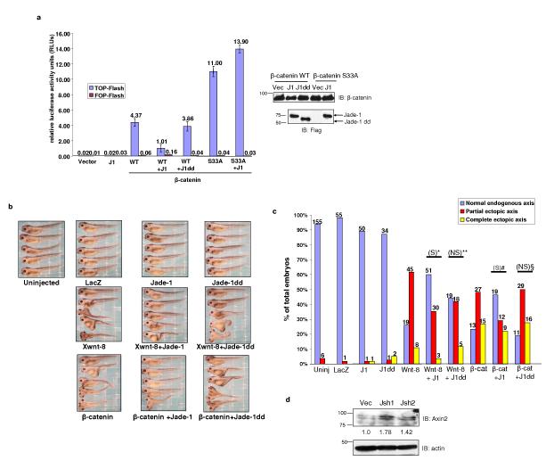 Figure 4. Jade-1 inhibits canonical Wnt signaling. (a) Jade-1 suppresses TCF/β-catenin reporter activity. TCF-responsive promoter-reporter TOP-Flash and nonresponsive control reporter FOP-Flash were used. Activity of the Wnt signaling pathway was quantified by measuring relative firefly luciferase activity units (RLUs) normalized to renilla luciferase. The 293T cells were transfected with wild-type β-catenin (β-cat) or β-catenin S33A and Jade-1 (J1) full-length or Jade-1 dd (J1dd). Mean results of 3 experiments are shown. Error bars = SEM. Protein extracts were probed using monoclonal Flag and β-catenin antibodies to examine the expression of constructs. (b) Jade-1 inhibits Xwnt8- and β-catenin-induced ectopic axis formation in Xenopus laevis embryos. Xwnt-8 (0.34-0.45 pg) or β-catenin (100-120 pg) mRNA, with or without Jade-1 (full-length 0.8 ng or dd 1.2 ng) mRNA, was injected into ventral blastomeres. LacZ (1.5 ng) served as a negative control. A total of 7 experiments was performed to compare full-length Jade-1 and Jade-1 dd injected embryos. (c) X-wnt-8- and β-catenin-induced ectopic axis is inhibited by Jade-1 in Xenopus laevis embryos. Histogram depicting Xenopus laevis embryo phenotypes is shown. Numbers shown at the top of each bar indicate the number of embryos in each category. Chi square test was applied to determine statistical significance. *= Xwnt-8 with Jade-1 versus Xwnt-8 (p <0.0001). # = Xwnt-8 with Jade-1 dd versus Xwnt-8 (p= 0.096), **= β-catenin with Jade-1 versus β-catenin (p<0.046), §=β-catenin with Jade-1 dd versus β-catenin (p=0.087). S = statistically significant, NS = not significant. (d) Jade-1 regulates endogenous Wnt targets. WCLs of 293 cells infected with empty vector (Vec) or Jade-1 silencing lentiviral constructs (Jsh1 and Jsh2) were probed for endogenous Axin2 and actin. One of 2 similar experiments is shown. |
