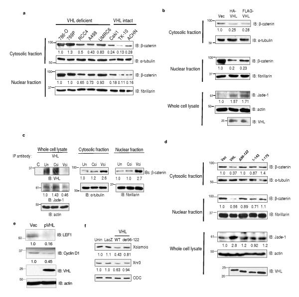 Figure 5. pVHL regulates endogenous β-catenin through Jade-1. (a) β-catenin protein levels depend on VHL status in renal cancer cell lines. Cytosolic and nuclear fractions of renal-cell carcinoma cell lines were probed for endogenous β-catenin protein. One of 2 similar experiments is shown. (b) pVHL down-regulates endogenous β-catenin. Extracts from 786-O cells stably expressing empty vector (Vec) or pVHL were probed for endogenous β-catenin protein. Jade-1 and pVHL expression was detected using polyclonal Jade-1 and monoclonal pVHL antibodies. Representative immunoblot of 3 experiments. (c) pVHL knock-down increases endogenous β-catenin abundance. To confirm pVHL knock-down, pVHL was immunoprecipitated using polyclonal pVHL or control (C) antibody from untransfected (Un) 293T cells or 293T cells transfected with VHL (VHLsi) or control siRNA (Csi) oligonucleotides because endogenous pVHL abundance is low17. Cell fractions were probed for endogenous Jade-1 and endogenous β-catenin protein. Representative immunoblot of 3 experiments. (d) Differential regulation of endogenous β-catenin by wild-type pVHL and pVHL truncations that do not stabilize Jade-1. Extracts of 293T cells transfected with wild-type pVHL, pVHL del96-122 (Î96-122), pVHL 1-143 and pVHL 1-175 were probed for pVHL, endogenous β-catenin and endogenous Jade-1 by immunoblot. One of 2 similar experiments is shown. (e) pVHL suppresses endogenous Wnt targets. WCLs of empty vector (Vec) or pVHL-expressing 786-O cell lines were probed for pVHL and endogenous LEF1 and cyclin D1. Representative immunoblot of 3 experiments. (f) Wild-type pVHL, but not pVHL del96-122, suppresses β-catenin/Tcf target genes. In vitro transcribed, capped LacZ (0.288 ng), wild-type VHL (WT) (0.194 ng) or VHL del96-122 (0.293 ng) mRNA was injected into dorsal blastomeres of Xenopus laevis embryos. Injected embryos were harvested at stage 10 for RT-PCR. Semiquantitative RT-PCR analysis of the Wnt targets Xsiamois and Xnr3 was performed in whole embryos. ODC served as control. Unin.= uninjected. |