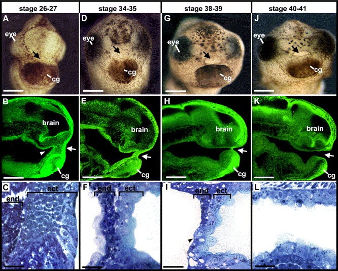 Fig. 1. Time course of primary mouth development. (A) Frontal view of stages 26â27, black arrow indicates the presumptive primary mouth, scale bar = 260 μm. (B) Optical sagittal section at stages 26â27, white arrow indicates presumptive primary mouth and white arrowhead indicates the evaginated endoderm. Anterior is to the right, scale bar = 200 μm. (C) Histological sagittal section at stages 26â27, bracketed regions show juxtaposed endoderm and ectoderm in the presumptive primary mouth. Anterior is to the right, scale bar = 25 μm. (D) Frontal view of stages 34â35, black arrow indicates invaginating presumptive primary mouth, scale bar = 260 μm. (E) Optical sagittal section of stages 34â35, white arrow indicates presumptive primary mouth. Note that, while the anterior most portion of the embryo in this figure is mid-sagittal, the more posterior of the embryo is not. This is due to curling of the embryo during processing. Anterior is to the right, scale bar = 200 μm. (F) Histological sagittal section of stages 34â35, bracketed regions show juxtaposed endoderm and ectoderm in presumptive primary mouth. Anterior is to the right, scale bar = 25 μm. (G) Frontal view of stages 38â39, black arrow indicates the deeply invaginated presumptive primary mouth, scale bar = 270 μm. (H) Optical sagittal of stages 38â39, white arrow indicates buccopharyngeal membrane. Anterior is to the right, scale bar = 200 μm. (I) Histological sagittal section of stages 38â39, bracketed regions show juxtaposed endoderm and ectoderm in presumptive primary mouth. Cell is shown spanning the width of the forming buccopharyngeal membrane (black arrowhead). (J) Frontal view of stages 40â41, black arrow indicates the primary mouth, scale bar = 270 μm. (K) Optical sagittal section of stages 40â41, white arrow indicates the primary mouth, scale bar = 200 μm. Anterior is to the right, scale bar = 25 μm. (L) Histological sagittal of stages 40â41, showing the primary mouth. Anterior is to the right, scale bar = 25 μm. Abbreviations: end, endoderm; ect, ectoderm; cg, cement gland.