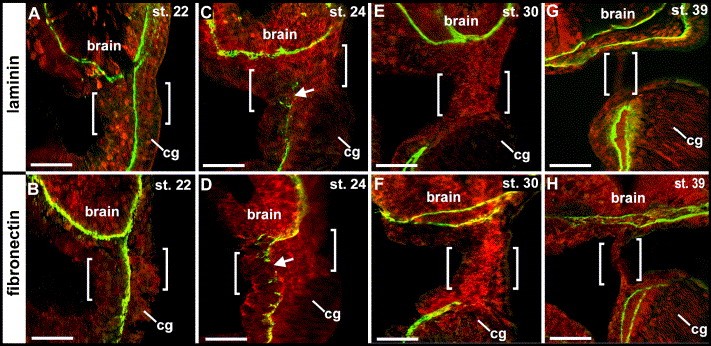 Fig. 2. Laminin and fibronectin immunohistochemistry during primary mouth formation. Immunoreactivity is shown in green and the counterstains in red (nuclear stain propidium iodide and beta-actin). The presumptive primary mouth region is bracketed and anterior is to the right in all figures. (A) Sagittal section of a stage 22 embryo showing laminin-immunoreactivity between endoderm and ectoderm, scale bar = 60 μm. (B) Sagittal section of a stage 22 embryo showing fibronectin-immunoreactivity between the endoderm and ectoderm, scale bar = 60 μm. (C) Sagittal section of a stage 24 embryo showing discontinuous laminin-immunoreactivity (white arrow) in the presumptive primary mouth, scale bar = 60 μm. (D) Sagittal section of a stage 24 embryo showing discontinuous fibronectin-immunoreactivity (white arrow) in the presumptive primary mouth, scale bar = 60 μm. (E) Sagittal section of a stage 30 embryo showing the absence of laminin-immunoreactivity in the presumptive primary mouth, scale bar = 60 μm. (F) Sagittal section of a stage 30 embryo showing the absence of fibronectin-immunoreactivity in the presumptive primary mouth, scale bar = 60 μm. (G) Sagittal section of a stage 39 embryo showing the absence of laminin-immunoreactivity in the presumptive primary mouth, scale bar = 60 μm. (H) Sagittal section of a stage 39 embryo showing the absence of fibronectin-immunoreactivity in the presumptive primary mouth, scale bar = 60 μm. Abbreviations: cg, cement gland.