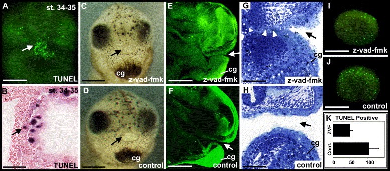 Fig. 3. The role of cell death in primary mouth formation. (A) Frontal view of embryo showing TUNEL labeling in the presumptive primary mouth (arrow) at stages 34â35, scale bar = 300 μm. (B) Histological sagittal section of TUNEL labeling in the presumptive primary mouth at stages 34â35. Arrow indicates TUNEL labeled cell in the inner ectoderm. Anterior is to the right, scale bar = 36 μm. (C) Embryo at stage 40 following treatment with z-vad-fmk (250 μm). Shows that the primary mouth does not form (arrow), scale bar = 330 μm. (D) Untreated control embryo at stage 40 with normal primary mouth (arrow), compare with panel C, scale bar = 330 μm. (E) Optical sagittal section of stage 40 embryo treated with z-vad-fmk as in panel C. Arrow indicates the unperforated primary mouth. Anterior is to the right, scale bar = 310 μm. (F) Untreated control embryo at stage 40 with normal primary mouth (arrow), compare with panel E. Anterior is to the right, scale bar = 310 μm. (G) Histological sagittal section of stage 40 embryo treated with z-vad-fmk as in panel C. Tissue remains thick where an opening should occur (white arrow heads), presumptive primary mouth region is indicated by the black arrow. Anterior is to the right, scale bar = 15 μm. (H) Histological sagittal section of an untreated control embryo at stage 40 with a normal primary mouth (black arrow), compare with G. Anterior is to the right, scale bar = 15 μm. (I) Dissected eye from embryo at stage 40 treated with z-vad-fmk, showing fewer TUNEL positive cells, scale bar = 200 μm. (J) Dissected eye from untreated control embryo at stage 40, showing TUNEL labeling (compare with I), scale bar = 200 μm. (K) Graph showing average number of cells from one eye from each of 5 embryos treated with z-vad-fmk (ZVF) and untreated control (Cont.). Difference is significant based on the MannâWhitney Rank Sum Test for non-normalized data (P = 0.008). Abbreviations: cg, cement gland.