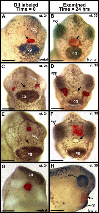 Fig. 4. Fate mapping the oral and surrounding regions. All figures show fluorescent DiI in red superimposed upon corresponding light micrograph. The left column show representative embryos at time 0 (stage 24) and the right column show representative embryos approximately 24 h after labeling (stage 35). (A) Frontal view of stage 24 embryo, just after DiI labeling in a medial position just dorsal to the cement gland in the region thought to be the presumptive primary mouth (arrow), scale bar = 200 μm. (B) Frontal view of a stage 35 embryo, 24 h after DiI labeling as in panel A. Shows labeling in the invaginating presumptive primary mouth (arrow), scale bar = 275 μm. (C) Frontal view of stage 24 embryo, just after DiI labeling in positions just lateral to the hatching gland (hg), the presumptive primary mouth is indicated (arrow), scale bar = 200 μm. (D) Frontal view of stage 35 embryo, 24 h after DiI labeling as in panel C. Shows no DiI in the stomodeum (arrow), scale bar = 275 μm. (E) Frontal view of stage 24 embryo just after DiI labeling in a dorsal region between the forming eyes, the presumptive primary mouth is indicated (arrow), scale bar = 200 μm. (F) Frontal view of stage 35 embryo, 24 h after DiI labeling as in E. Shows no DiI in the stomodeum (arrow), scale bar = 275 μm. (G) Ventral view of stage 24 embryo, an incision was made ventral to the cement gland and tissue pulled forward to expose and DiI label the anterior endoderm, scale bar = 200 μm. (H) Lateral view of stage 35 embryo, 24 h after DiI labeling as in G. Shows DiI labeled endoderm in the tissue underlying the stomodeum (arrow), scale bar = 275 μm.