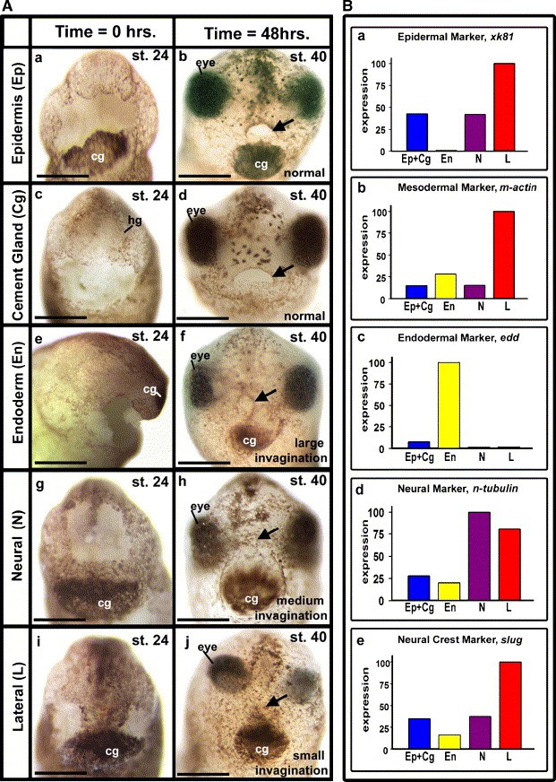 Fig. 5. (A) Summary of extirpation experiments. The first column of the table indicates the name of the tissue extirpated. The second column shows representative embryos just after extirpation at time zero (stage 24). The third column shows representative embryos 48 h after the operation (stages 40â41). (a) Frontal view of stage 24 embryo just after âEpidermisâ (inner ectoderm and outer epidermal layers) in the presumptive primary mouth was extirpated, scale bar = 270 μm. (b) Frontal view of a stage 40 embryo, 48 h after extirpation as in panel A. Shows a normal primary mouth (arrow), scale bar = 350 μm. (c) Frontal view of stage 24 embryo, just after the Cement Gland was extirpated, scale bar = 270 μm. (d) Frontal view of a stage 40 embryo, 48 h after extirpation as in panel C. Shows a normal primary mouth (arrow), scale bar = 350 μm. (e) Lateral view of an embryo just after âEndodermâ (tissue underlying the ectoderm) in the presumptive primary mouth was extirpated, scale bar = 270 μm. (f) Frontal view of a stage 40 embryo, 48 h after extirpated as in e, g or i showing one of the possible abnormal phenotypes, an un-perforated primary mouth and large invagination (arrow), scale bar = 350 μm. (g) Frontal view of stage 24 embryo just after â Neuralâ (tissue dorsal to the oral region) was extirpated, scale bar = 270 μm. (h) Frontal view of a stage 40 embryo, 48 h after extirpated as in e, g or i showing one of the possible abnormal phenotypes, an un-perforated primary mouth and medium size invagination (arrow), scale bar = 350 μm. (i) Frontal view of stage 24 embryo just after tissue lateral to the oral region was extirpated, scale bar = 270 μm. (j) Frontal view of a stage 40 embryo, 48 h after extirpated as in e, g or i showing one of the possible abnormal phenotypes, an un-perforated primary mouth and very small barely detectable invagination (arrow), scale bar = 350 μm. (B) Quantitative RT-PCR results performed on extirpated tissues. Numbers were scaled to a maximum value of 100% for each gene. (a) The epidermal marker cytokeratin xk81, is expressed at 42.9% in âEpidermisâ + âCement glandâ, 0.68% in âEndodermâ, 42.2% in âNeuralâ, and 100% in âLateral tissuesâ. (b) The mesodermal marker, m-actin, is expressed at 14.8% in âEpidermisâ + âCement glandâ, 28.3% in âEndodermâ, 14.9% in âNeuralâ, and 100% in âLateralâ. (c) The endodermal marker, edd is expressed at 7.7% in âEpidermisâ + âCement glandâ, 100% in âEndodermâ, 1.57% in âNeuralâ, and 1.71% in âLateralâ tissues. (d) The neural marker, n-tubulin, is expressed at 27.7% in âEpidermisâ + âCement glandâ, 20.0% in âEndodermâ, 100% in âNeuralâ, and 80.7% in âLateralâ tissues. (e) The neural crest marker, slug is expressed at 35.0% in âEpidermisâ + âCement glandâ, 16.2% in âEndodermâ, 37.61% in âNeuralâ, and 100% in âLateralâ tissues. Abbreviations: Ep, Epidermis; Cg, Cement gland; En, Endoderm; N, Neural; L, Lateral.