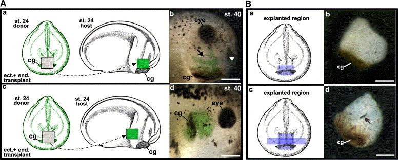 Fig. 7. (A) Summary of presumptive primary mouth endoderm and ectoderm transplants. (a) Schematic diagram of the operation. The ectoderm and endoderm from the presumptive primary mouth region and the cement gland were removed from a donor embryo, labeled with GFP, and transplanted to region next to the endogenous presumptive primary mouth of an un-labeled recipient embryo at the same stage. (b) Lateral view of a stage 40 embryo that was operated on as in a, resulting in an ectopic primary mouth (arrow), next to the endogenous primary mouth (arrowhead), scale bar = 250 μm. (c) Schematic diagram of the operation. The presumptive primary mouth ectoderm and endoderm and cement gland removed from a donor embryo, labeled with GFP, and transplanted to a region posterior to the branchial arches of an un-labeled recipient embryo at the same stage. (d) Lateral view of a stage 40 embryo that was operated on as in c, resulting in no obvious ectopic primary mouth, scale bar = 250 μm. (B) Summary of explant experiments. (a) Schematic diagram showing the ectoderm and underlying endoderm, including the cement gland that was removed and cultured. (b) A representative explant as dissected in a did not form any opening in the tissue, scale bar = 185 μm. (c) Schematic diagram showing the presumptive ectoderm, underlying endoderm, lateral and neural regions, including the cement gland that was removed and cultured. (d) A representative explant as dissected in c formed an opening through the tissue (arrow), scale bar = 185 μm.