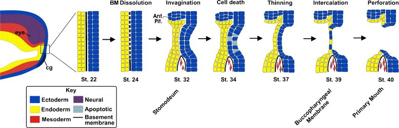 Fig. 8. Schematic diagram summarizing the morphological changes during primary mouth development. On the left is a sagittal section of an early tailbud embryo showing the different germ layers. The box indicates the presumptive primary mouth which is magnified in the subsequent pictures. Each picture represents the presumptive primary mouth at progressively later stages. The first morphological change at stage 22 is the dissolution of the basement membrane (BM) in the presumptive primary mouth region. The next anatomical change is the formation of a depression or stomodeum, which begins roughly at stage 30 and is more apparent by stage 32. Approximately 7â10Â h after the stomodeum starts to form, at stages 34â35, we observed a burst of apoptosis. This was followed by thinning of the region and by stage 39 some cells could be seen to intercalate and form 1â2 cell layers, called the buccopharyngeal membrane. Finally, by stage 40, a perforation or hole can be seen in the buccopharyngeal membrane that over several hours widens to form an opening to the foregut, the primary mouth.