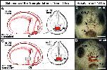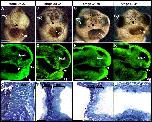 Fig. 6. Summary of transplant experiments. The first column shows schematic diagrams of the operations. The second (right) column shows representative embryos 48 h after operation. (A) The ectoderm from the presumptive primary mouth region of a Texas Red-Dextran labeled embryo was removed from a donor embryo and transplanted to the presumptive primary mouth of a recipient un-labeled embryo at the same stage. (B) Frontal view of a stage 40 embryo that was operated on as in A, resulting in formation of a normal primary mouth (arrow), scale bar = 250 μm. (C) The lateral flank ectoderm was removed from a donor embryo, labeled with Texas Red-Dextran, and transplanted to the presumptive primary mouth of a un-labeled recipient embryo at the same stage. (D) Frontal view of a stage 40 embryo that was operated on as in C, resulting in a normal primary mouth (arrow), scale bar = 250 μm.