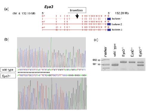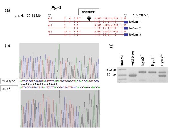 Figure 1. Generation of Eya3-deficient mice by insertional mutagenesis. (a) Schematic illustration of the gene trap vector integration into intron 7 of the Eya3 gene resulting in a loss of the following exons. (b) Sequence fragment of the Eya3 gene. The upper chromatogram displays the sequence of wild-type mice, while the lower chromatogram shows the vector integration in mutant mice at 132.23 Mb on chromosome 4 (Ensembl database, release No. 50, 2008). (c) Eya3 mutant mice were genotyped by triplex PCR with a genomic forward primer combined with a genomic reverse primer for identification of wild-type animals and with a reverse primer within the gene trap vector for identification of homozygous mutant animals.