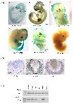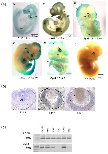 Figure 3. Expression pattern of Eya3 in mice. (a) Expression analysis of Eya3 by lacZ-staining in homozygous Eya3-/- embryos (A – E, E9.5 – E13.5) revealed an expression of Eya3 in specific regions including the eyes, limbs, somites, branchial arches, tectorial regions, and in different areas of the developing brain. Since the expression pattern of Eya3 is identical, if analyzed by in-situ hybridization in wild-type embryos or by β-Gal expression in Eya3-/- mutant mice, only the mutant data are shown. Wild-type embryos as negative controls did not show lacZ-staining (F). (Ba, branchial arches; Ey, eye; Ea, ear; Fl, forelimb; FlB, forelimb bud; H, heart; Hl, hindlimb; HlB, hindlimb bud; OlP, olfactory pit; Ol, olfactory region; Ov, optic vesicle; OtV, otic vesicle; Pt, pretectorial region; So, somites; Tc, tectorial region; Ta, tail; Te, telencephalon; TeV, telencephalic vesicle; Tg, trigeminal nerve; Wf, follicle of whiskers). (b) Expression analysis of Eya3 in the eye with in-situ hybridization displayed transcripts in the detaching lens at E11.5 and afterwards in the lens epithelium and in the retina (E15.5 – E17.5) (L, lens; Le, lens epithelium; Lfc, lens fiber cells; Lv lens vesicle; R, retina; On, optic nerve). (c) RT-PCR with cDNA of adult mice showed an Eya3 expression in muscle, heart, brain, kidney and lung, however, no Eya3 transcript was found in the liver.
