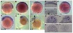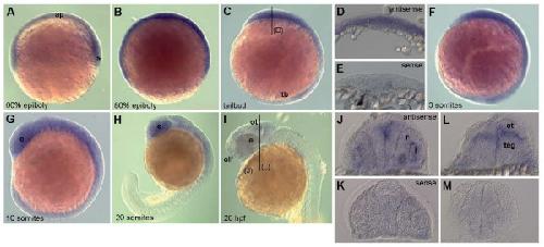 Figure 4. Whole-mount in-situ hybridization for eya3 expression in zebrafish embryos. Whole-mount in-situ hybridization for eya3 expression in zebrafish embryos reveals a ubiquitous expression of eya3 throughout gastrulation and early somitogenesis (A-F). Cross sections at the tailbud stage (level indicated in C) confirm expression in all cell layers (D), compared to a hybridization using the sense probe (E). The expression is more restricted to the anterior part of the embryo at 14 hpf (G). From 19 hpf the expression is most prominent in the developing brain and eye (H). By the beginning of the second day (28 hpf) (I) eya3 expression strongly decreases and is only weakly detectable in the eye, optic tectum, tegmentum and olfactory placode. This is confirmed on cross sections (J, L, at the levels indicated in I) compared to hybridization with the sense probe (K, M). Abbreviations: ap, animal pole; e, eye; l, lens; ot, optic tectum; olf, olfactory placode; r, retina; s, shield; tb, tailbud; teg, tegmentum.