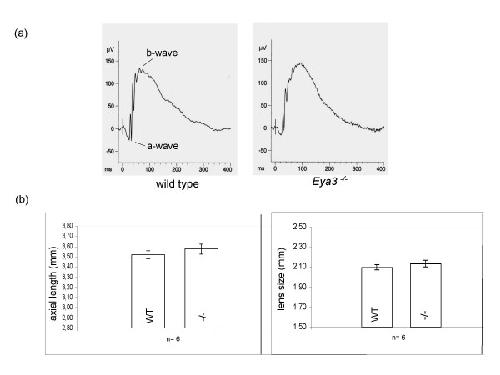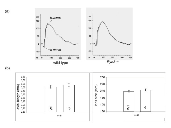 Figure 6. Electroretinography (ERG) and laser interference biometry. (a) The electroretinography displays no obvious deviations in the shape of the a-wave (response of photoreceptor cells) and b-wave (response of bi-polar cells) between wild-type controls and Eya3 mutant animals. (b) Measurement of the axial length of the entire eye and of the lens size in particular did not reveal significant alterations in Eya3 mutant animals compared to wild-type controls.