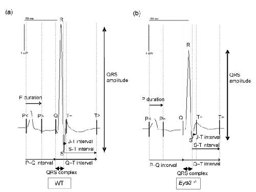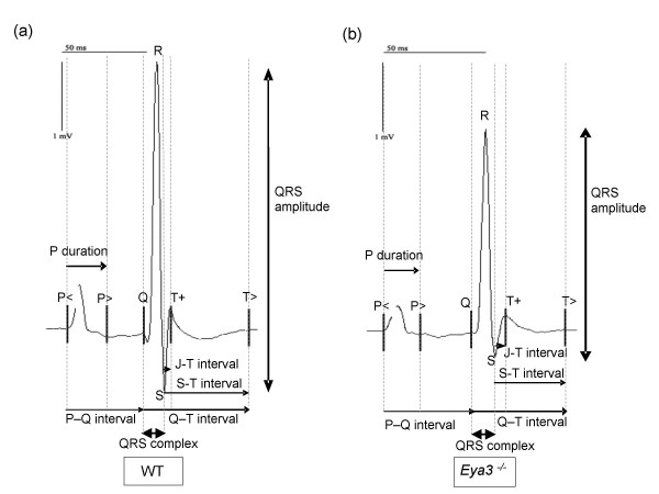 Figure 7. Electrocardiography (ECG) of wild-type and Eya3-/- mutant mice. a) Electrocardiogram of a wild-type control. b) Electrocardiogram of an Eya3-/-animal is shown. Eya3 mutant mice of both sexes displayed several alterations compared to the control animals: the PQ-interval and the JT-interval are extended in mutants, while the amplitude of the QRS-complex is reduced in Eya3-/- animals (alterations are indicated by black arrows).