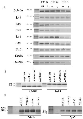 Figure 8. Eya3 and the retinal determination network. a) The expression of all six Six genes (Six1 – Six6) and the two Dach (Dach1, Dach2) genes have been investigated in wild-type and homozygous mutant embryos by RT-PCR using total mRNA; β-actin was used as loading control. b) Eya3 expression was tested in embryos of two homozygous Pax6 mutant alleles (Pax6Aey11 and Pax6ADD4802); β-actin was used as loading control. b) Eya3 expression was tested in embryos of a homozygous Pitx3 mutant allele (Pitx3ak); β-actin was used as loading control.