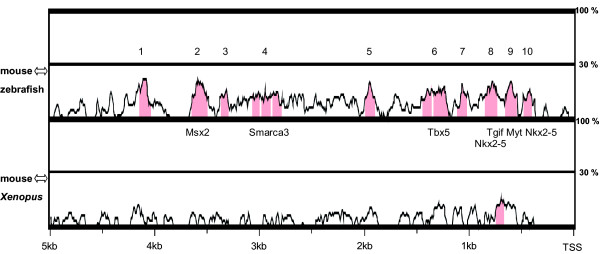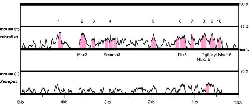 Figure 10. Conserved elements in Eya3 promoter/enhancer region. Sequence analysis of 5 kb upstream from Eya3 transcriptional start site for mouse, zebrafish and Xenopus using mVISTA (parameters: 50% sequence identity, 80 bp window length). The analysis revealed 10 conserved non-coding regions within the mouse-zebrafish alignment (sequence identity: 1325 bp at 52.9%, highlighted in red) and only 1 conserved non-coding region for the mouse-Xenopus alignment (sequence identity: 78 bp at 50%). Transcription factor binding sites of a matrix similarity of 1.000 are mentioned. TSS, transcription start site.
