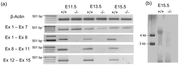 Figure 2. Mutation of Eya3 causes a loss of exons 8 – 15 in homozygous mutants. (a) RT-PCR with cDNA of wild type and Eya3-/- embryos at developmental stages E11.5 (whole embryo), E13.5 (head), E15.5 (head) showed the loss of exons 8 – 15 of the Eya3 gene in Eya3-/- mice. (b) Northern-Blotting using RNA of wild-type and Eya3-/- embryos (E15.5) with a riboprobe against exons 8 – 11 confirmed the data received from RT-PCR.