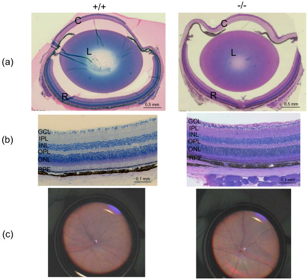 Figure 5. Histology and funduscopy of the eye in Eya3 mouse mutants. (a) Histology of the eye showed no morphological differences between wild-type mice and homozygous mutants (C, cornea; L, lens; R, retina). In line with these results histological analysis (b) and funduscopy (c) of the retina could not detect structural impairments in mutant animals (GCL, ganglion cell layer; IPL, inner plexiform layer; INL, inner nuclear layer; OPL, outer plexiform layer; ONL, outer nuclear layer; RPE retinal pigment epithelium).