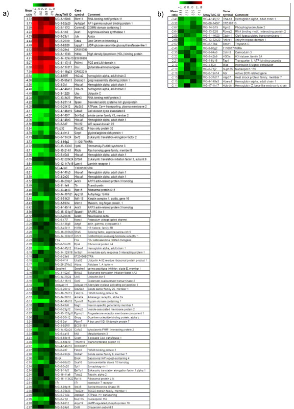 Figure 9. Heat plots of gene expression profiles from 8 DNA microarray experiments of Eya3 mutants versus control mice. Differential gene expression was analyzed in the brain (a) and in the heart (b). One dye-flip pair represents two experimental replicates of each analyzed mouse (A-D). One ArrayTAG ID is the unique probe identifier from the LION Bioscience clone set. Official gene symbols are given. The scale bar encodes the ratio of the fold induction; 0.7% (a) or 1.3% (b) of the elements are above the upper limit of the color range selection (red is up-regulated and green down-regulated in the Eya3 mutant mice).