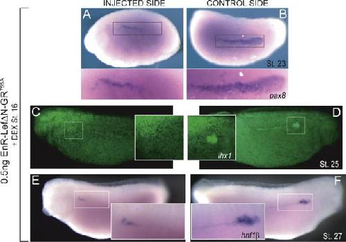 Fig. 7. EnR-LefδN-GR755A generates reduced expression of pronephric mesenchyme markers. EnR-LefδN-GR755A (0.5 ng) with rhodamine dextran tracer was injected into single V2 blastomeres at the eight-cell stage and dexamethasone was added at stage 16. Embryos were fixed at stage 23 (A and B), stage 25 (C and D), and stage 27 (E and F). The injected side of embryos shows reduced expression of pronephric mesenchyme markers XPax8 (pax8) (A), XLim1 (lhx1) (C), and vHNF1 (hnf1β) (E), shown via whole-mount colorimetric or fluorescent in situ. The control side of embryos shows expected normal distribution of pronephric mesenchyme markers (B, D, F). Injected and control side images shown are from the same embryo and insets are enlargements of the pronephric region. |