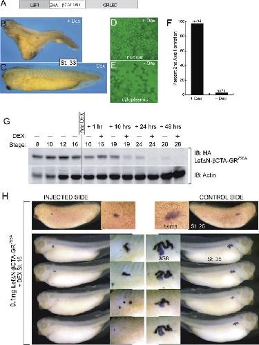 Fig. 9. Characterization and pronephric phenotypic analysis of LefδN-βCTA-GR755A, an inducible fusion construct promoting Wnt/β-catenin signaling. (A) LefδN-βCTA-GR755A schematic including the mouse Lef1 DNA-binding HMG box (aa 265â391), a double HA epitope-tag, the mouse β-catenin transactivation domain, and the human Glucocorticoid receptor hormone-binding domain (aa 512â777). Xenopus embryos were injected with 0.1 ng LefδN-βCTA-GR755A into a single ventral-vegetal blastomere at the four-cell stage and grown to stages 33â35 with or without dexamethasone. In the presence of dexamethasone, embryos showed a robust level of secondary axis phenotypes (B), while embryos not treated with dexamethasone developed normally (C). Fluorescent (FITC) immunohistochemistry of animal caps excised from stage 9/10 embryos show nuclear localization of LefδN-βCTA-GR755A in the presence of dexamethasone (D) and cytoplasmic localization in the absence of dexamethasone (E) (prior to animal cap excision, embryos were injected with 1.0 ng LefδN-βCTA-GR755A into single animal-dorsal blastomeres at the 2-cell stage). (F) Most all embryos noted in B (presence of dexamethasone) exhibited one or more features reflecting an ectopic dorsal axis, while none of those noted in C (absence of dexamethasone) exhibited duplicate axes. (G) To assess LefδN-βCTA-GR755A protein stability following dexamethasone addition, a time course was undertaken of embryos injected with 0.5 ng LefδN-βCTA-GR755A into single vegetal-ventral (V2) blastomeres at the eight-cell stage. HA epitope-tag Western blotting shows the inducible chimera (like that of EnR-LefδN-GR755A and EnR-GR) is stably present until addition of dexamethasone at stage 16, at which time each experiences increased metabolic turnover. (H) Xenopus embryos injected with 0.1 ng LefδN-βCTA-GR755A into single vegetal-ventral (V2) blastomeres at the eight-cell stage (+dexamethasone at stage 16) showed decreased expression of an early pronephric tubule epithelial marker hnf1β (in situ at stage 26), and variable decreased expression of a more mature tubule epithelial marker 3G8 (immunostaining at stage 35). The left panels show whole tadpoles along with enlargements of observed phenotypes on injected sides, while right panels depict uninjected/control sides with corresponding enlargements. |
