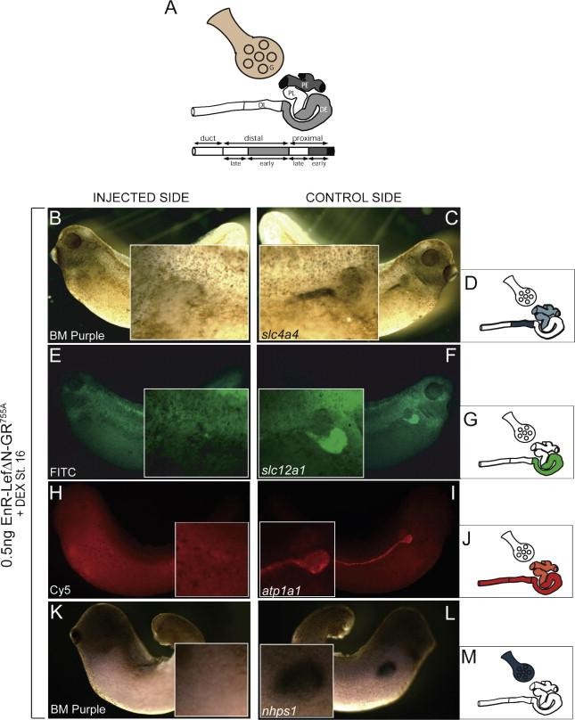 Fig. 5. EnR-LefδN-GR755A inhibits expression of multiple pronephric glomus, epithelial tubule, and duct-specific genes. (A) Schematic showing pronephric glomus, tubule and duct segment nomenclature at stage 35. The glomus, labeled G, is shown in beige. The early and late segments within both the proximal and distal domains of tubules are shown in dark and light gray, respectively. The duct is shown in white. Injection of EnR-LefδN-GR755A (0.5 ng) with rhodamine dextran tracer was performed into single V2 blastomeres at the eight-cell stage and dexamethasone was added at stage 16. Embryos were fixed at stages 35/36 (BâC, EâF, HâI, KâL) and expression of several pronephric marker genes analyzed by whole-mount colorimetric or fluorescent in situ. Schematics represent the expression domains of four later stage pronephric markers (D, G, J, M). Shown are injected and control sides of embryos, each including insets of enlarged pronephric regions. Upon the inhibition of Wnt/β-catenin signaling, the strong late distal expression of the sodium bicarbonate cotransporter XNBC1 (slc4a4) (D) is lost on the injected (B) versus control side (C). Earlier weaker expression of this same marker is also lost (not shown). The early distal Na-K-2Cl cotransporter NKCC2 (slc12a1) (G) shows complete loss of expression on injected (E) versus control side (F). Expression of the NaK ATPase (atp1a1) in both the pronephric tubules and duct (J) is lost on the experimental side (H) as compared to the control side (I) when Wnt/β-catenin signaling is inhibited. Additionally, inhibition of Wnt/β-catenin signaling causes the normal expression of nephrin (nhps1) in the glomus (M) to be reduced in the injected side (K) as compared with the control side (L). |
