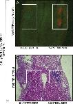 Fig. 6. EnR-LefδN-GR755A reduces expression of NaK ATPase and nephrin in the pronephric region. Cross sections of embryos injected with EnR-LefδN-GR755A (left V2 blastomere at eight-cell stage), induced at stage 16, fixed at stage 35/36, and stained by in situ hybridization. (A) Fluorescent in situ hybridization of cross sections of stage 35/36 embryos shows that EnR-LefδN-GR755A inhibits NaKATPase (atp1a1) expression within the injected side (left) versus the control side (right). (B) In situ hybridization shows that expression of nephrin (nhps1), a glomus marker, is inhibited by EnR-LefδN-GR755A in injected (left) sides of stage 35/36 embryos as compared to control (right) sides. |