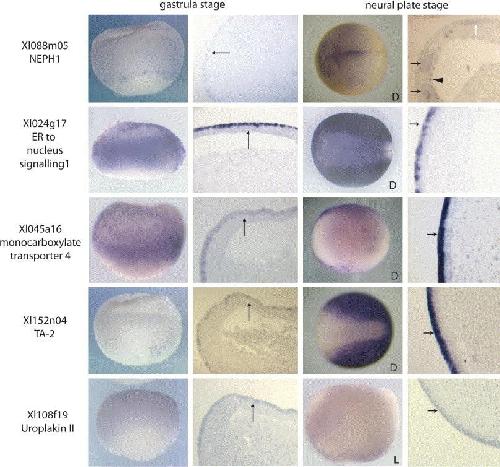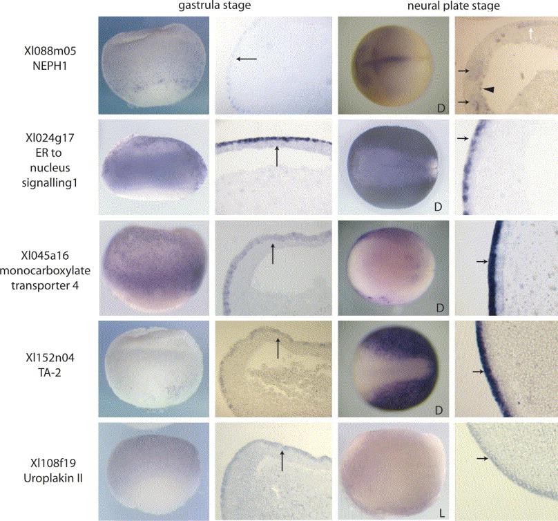 Fig. 2. Genes with superficial expression; Part 2. A wholemount and a section are shown for each gene at gastrula (left-hand panels) and neural plate stage (right-hand panels). The gastrula stage wholemounts have the animal hemisphere to the top. The sections show expression in the animal hemisphere except for NEPH1 which shows the marginal zone as it has stronger expression in the marginal zone. The stage 14 wholemounts are shown as lateral (L) or dorsal views (D) as indicated with anterior to the left. The stage 14 sections are transverse and show expression in the epidermis except for NEPH1 which is sagittal. NEPH1 has a complicated expression pattern which includes the notochord (white arrow), two bands in the anterior neural plate (black arrows) and endoderm (arrow head). Arrows indicate areas of expression. The genes are labelled with the top blast hit and unique EST identifier (e.g., Xl088m05).