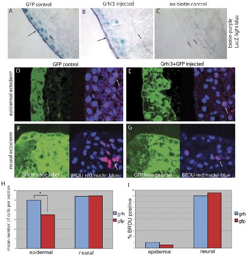 as the epidermis was expanded. Arrows highlight biotin staining and black bars indicate the boundaries of the epidermis. D�I, Grh does not promote