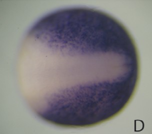 cnn2 (calponin 2) gene expression in a Xenopus laevis embryo, NF stage 14, as assayed by in situ hybridization. Dorsal view: anterior left.