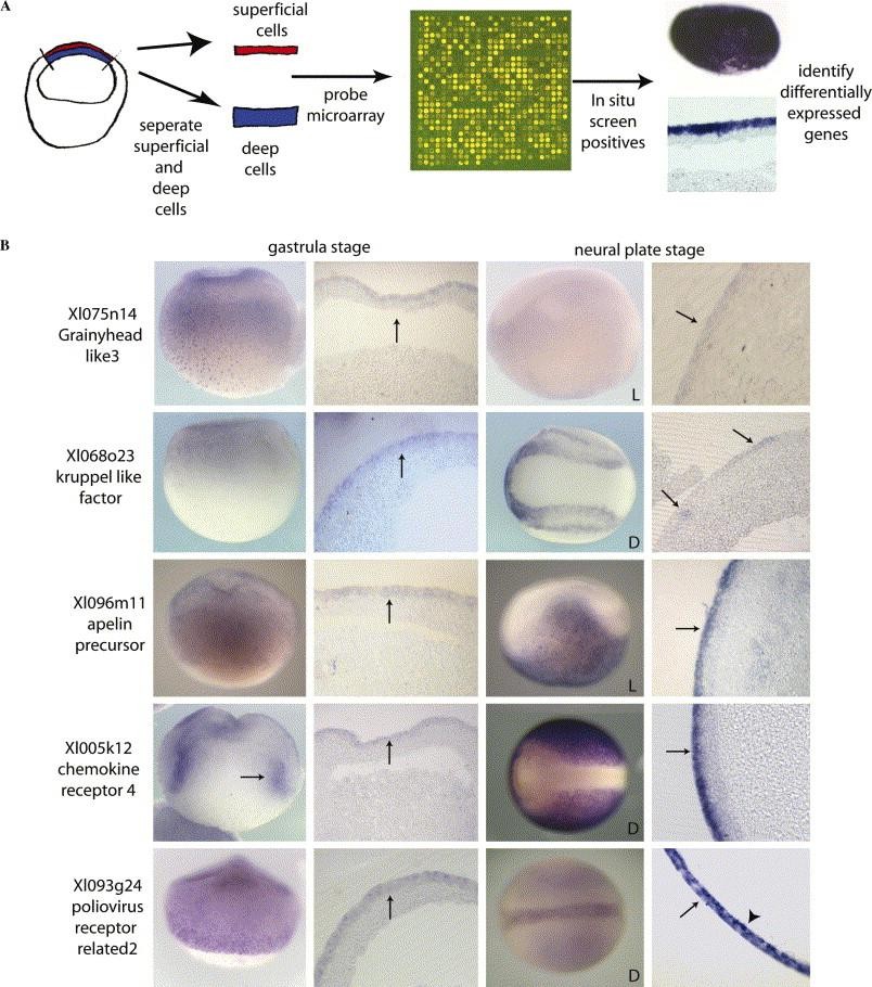 Fig. 1. A microarray and in situ screen to isolate genes differentially expressed between the superficial and deep cells. (A) Superficial and deep cells were isolated from early Xenopus embryos and used to make a probes which were hybridised to the microarray. The positives were then screened by in situ hybridisation to confirm that they showed differential expression. (B) Genes with superficial expression; Part 1. A wholemount and a section are shown for each gene at gastrula (left-hand panels) and neural plate stage (right-hand panels). The gastrula stage wholemounts have the animal hemisphere to the top. The sections show expression in the animal hemisphere. The chemokine receptor 4 wholemount embryo is bisected to show the expression in the involuting marginal zone. The stage 14 wholemounts are shown as lateral (L) or dorsal views (D) as indicated, with anterior to the left. The stage 14 sections are transverse and show the expression in the epidermis, except for the krupple like factor where the expression at the border of the neural plate is shown. The poliovirus receptor related 2 has expression in the deep epidermis (arrow head) as well as the superficial cell epidermis. Arrows indicate areas of expression. The genes are labelled with the top blast hit and unique EST identifier (e.g., Xl075n14).